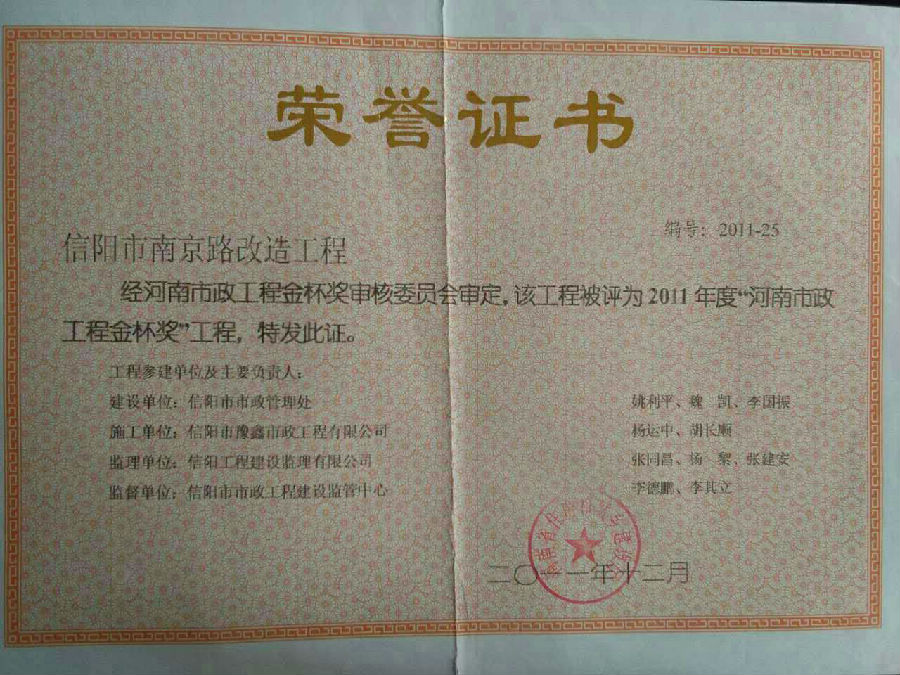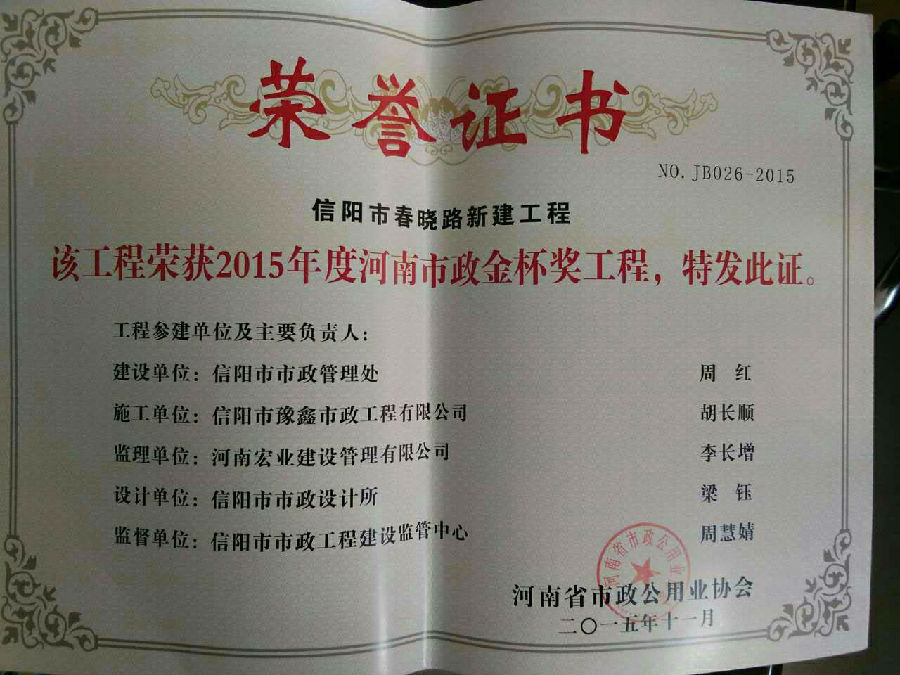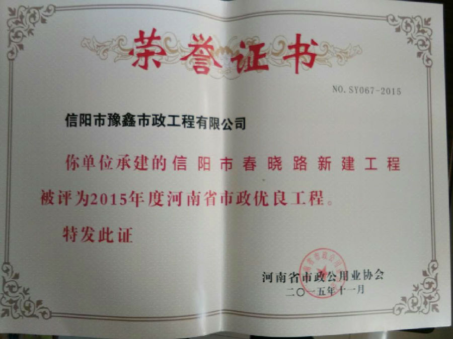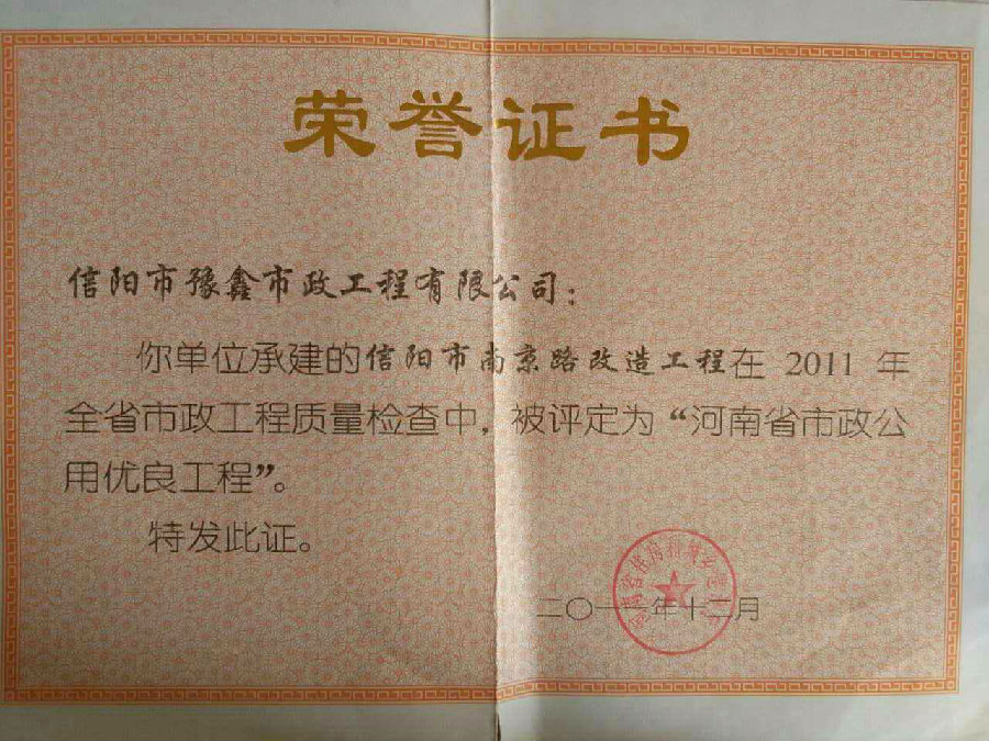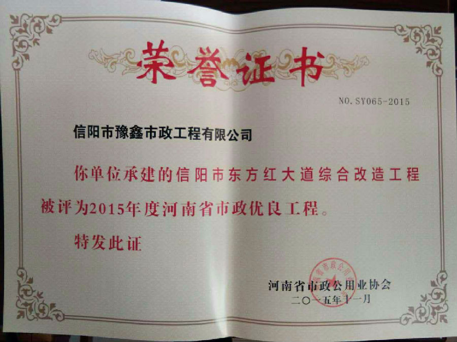好風(fēng)憑借力,送我上青云。近年來,公司積極參與城市市政基礎(chǔ)設(shè)施建設(shè)施工,積極參與市場競爭,先后承擔(dān)施工了市政府重點工程南京路道路改造工程、春曉路道路改造工程,東方紅大道道路改造工程、龍江東路新建工程等重點民生工程,其中南京路道路改造工程被省建設(shè)廳評為“中州杯”, 春曉路和東方紅大道道路改造工程被省建設(shè)廳評為“省優(yōu)工程”,成為城區(qū)一道道亮麗的風(fēng)景線。參與施工了市典范小區(qū)“臺北城上城”、“恒大名都”以及師范學(xué)院、職業(yè)技術(shù)學(xué)院、交警支隊和軍區(qū)道路工程,參與施工了雞公山管理區(qū)、南灣管理區(qū)、明港鎮(zhèn)和羅山縣等部分道路小區(qū)工程施工,累計大小各類施工工程三百余項,企業(yè)影響力不斷擴(kuò)大、輻射力不斷增強(qiáng),市場份額不斷提高,企業(yè)信譽不斷彰顯,為信陽城市建設(shè)做出了積極貢獻(xiàn),為企業(yè)的可持續(xù)發(fā)展插上了騰飛的翅膀。